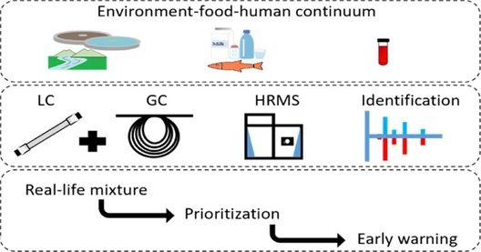 Suspect screening using LC- and GC-HRMS identified 547 chemicals across environmental, food, and human samples. Pharmaceuticals, pesticides, and personal care products were the most frequent contaminants.